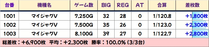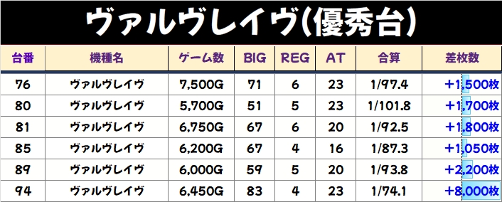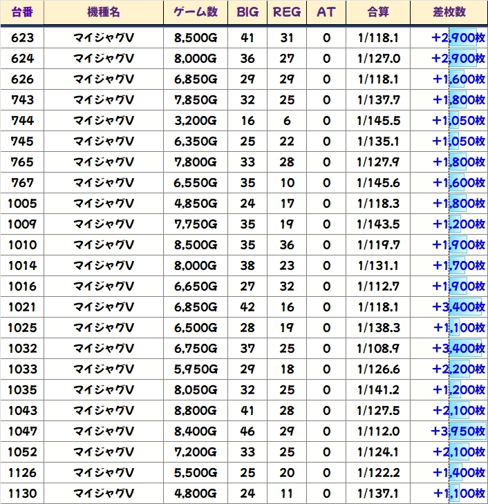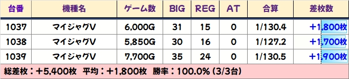 この日は万枚超こそなかったですが、6台と多くの台数が1000枚以上を獲得しました。ヴヴヴもSANKYO機種の1つなので普段以上に幅広く仕掛けが入っていた可能性が高そうです。