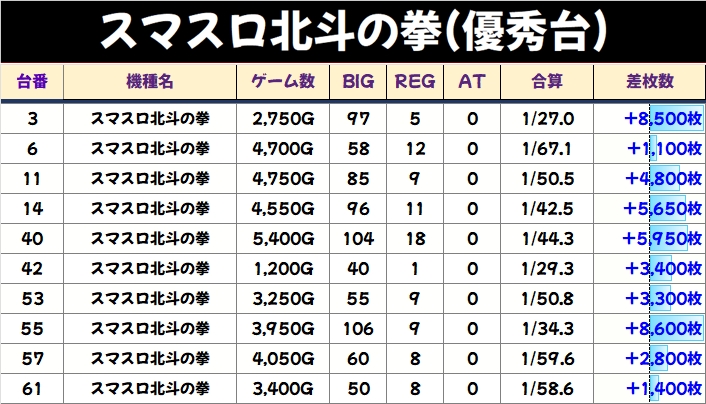 北斗は最初に紹介した全系並びを再掲するとともに単品優秀台をピックアップ。単品からは8000枚オーバー2台に5000台超が3台、もともと台数の多い機種ですがこれだけ大量獲得台が出るということは間違いなく複数台に使われている証でしょう。