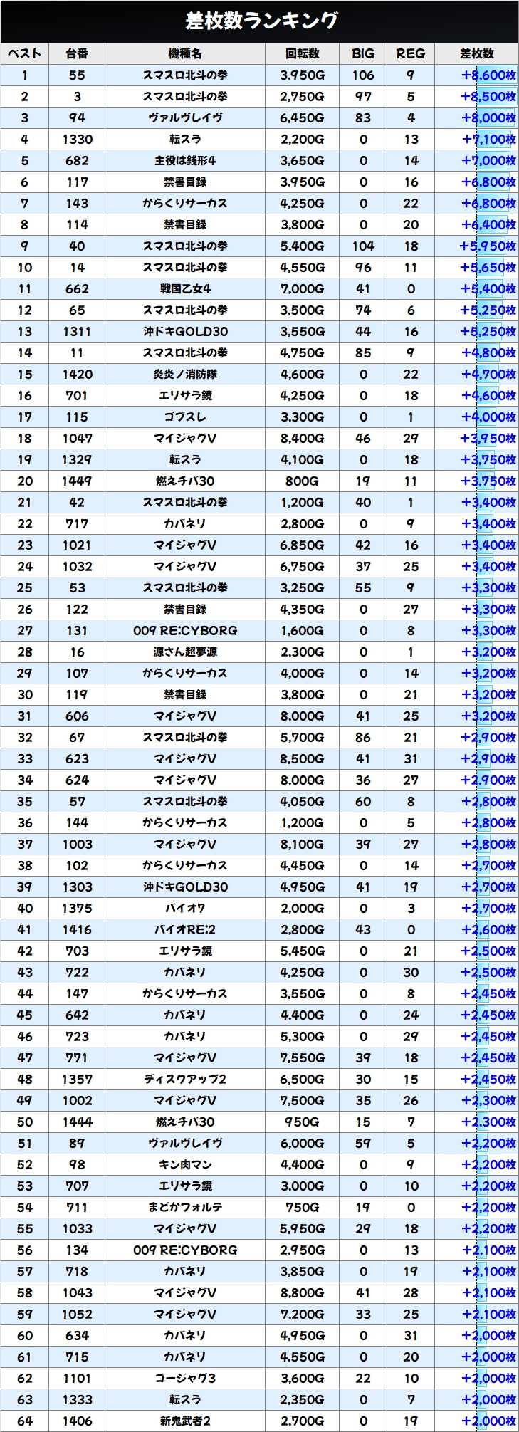 本日は64台が+2000枚以上を記録しており、TOP3は3の日機種が独占しました。