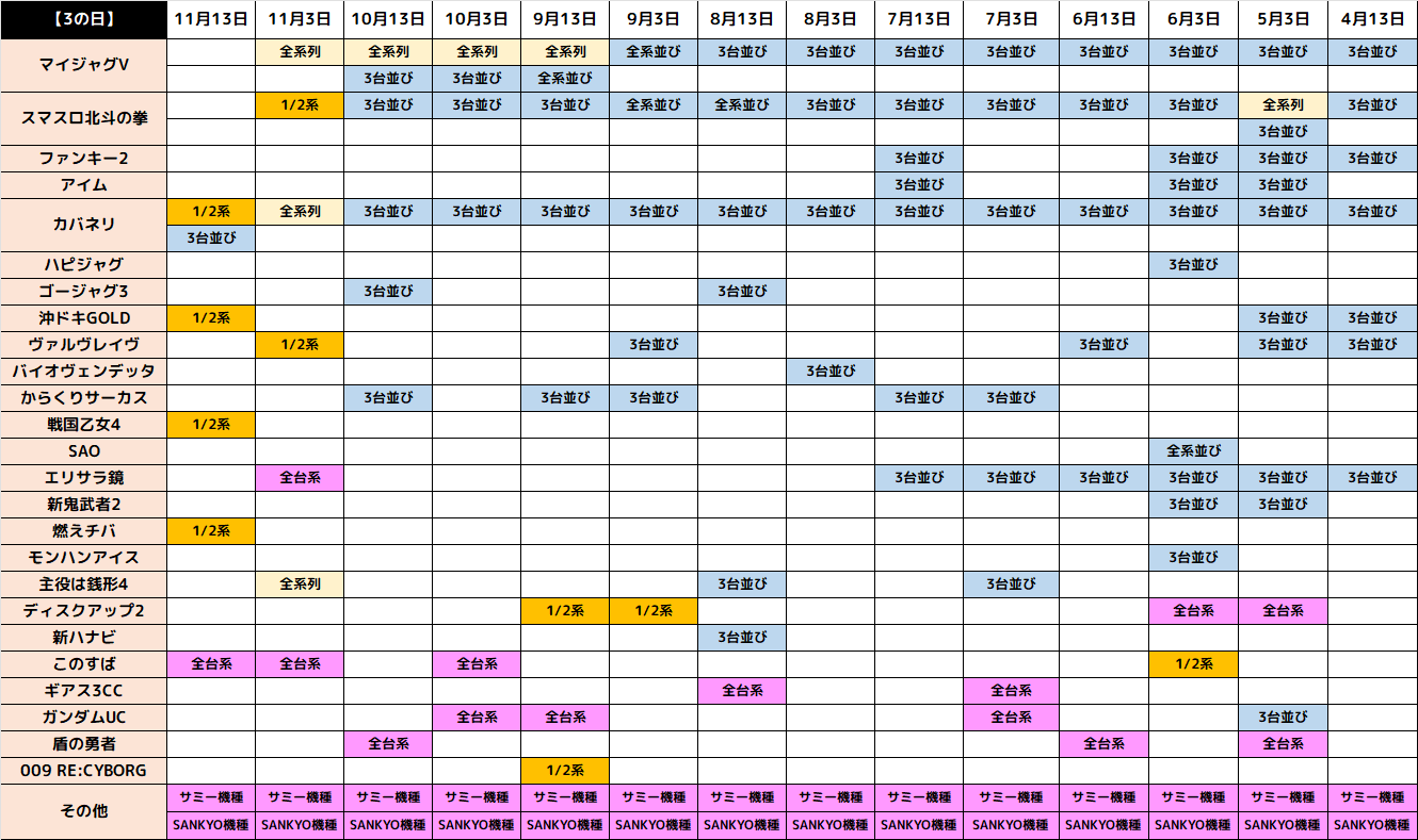 3のつく日はサミー機種&SANKYO機種が強い1日で、日曜日は10台並びが高頻度で仕掛けられます。