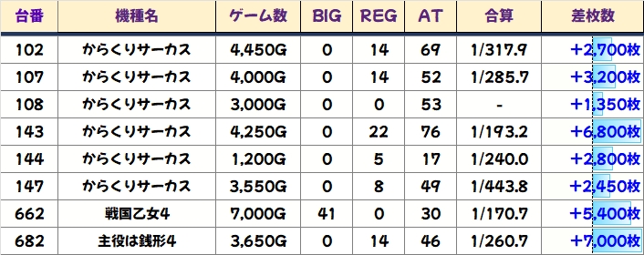 3の機種とも絡んでいるからくりサーカスはピックアップ台が多くありました(再掲)。乙女4や銭形4にも大量獲得台はありますが、1台だけという可能性は少ないので埋もれてしまった可能性大。SAOは大量獲得台こそなかったですが、そちらも埋もれてしまったのでしょう。