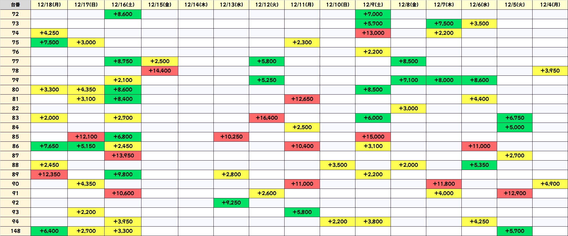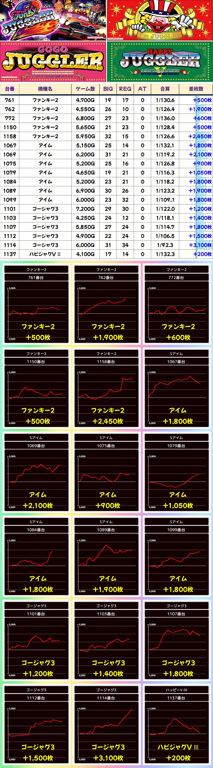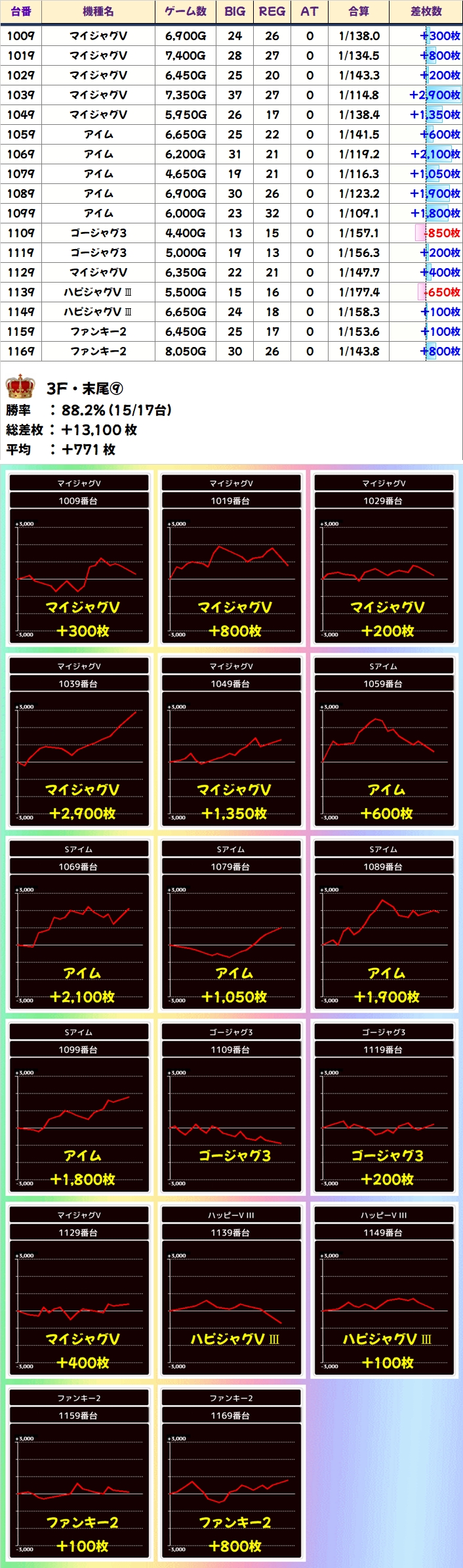 +4250枚を筆頭に4台中3台がプラスで平均+1475枚を達成! 流石です!