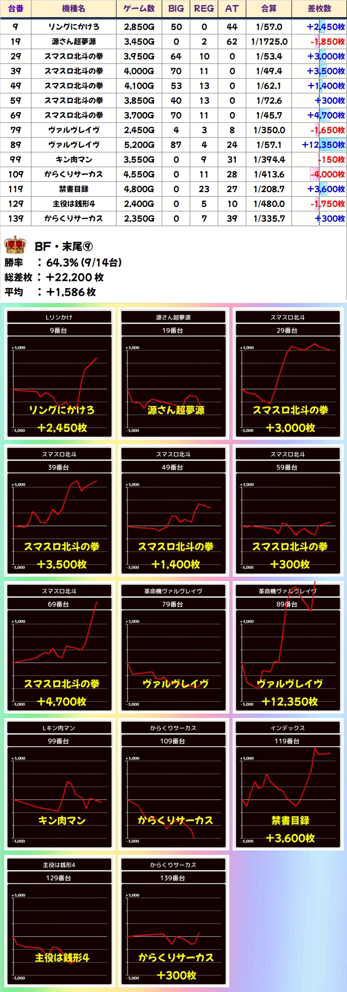 BFは前回に続いて末尾⑨が当たりで、平均+1586枚と結果を残しました!