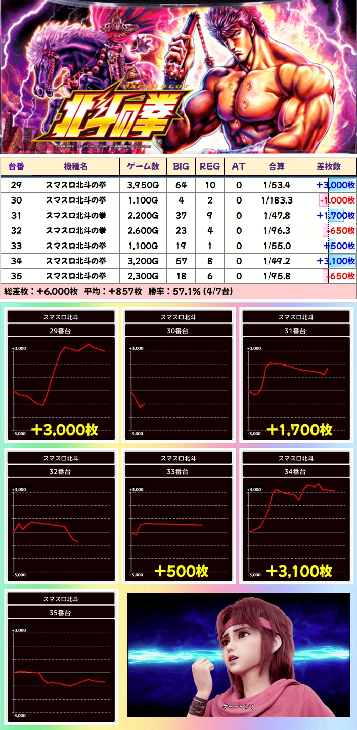 中でも「スマスロ北斗」は+4700枚を筆頭に全5台が大きなプラスに! 北斗は今回も機種末尾は間違いないかなと。