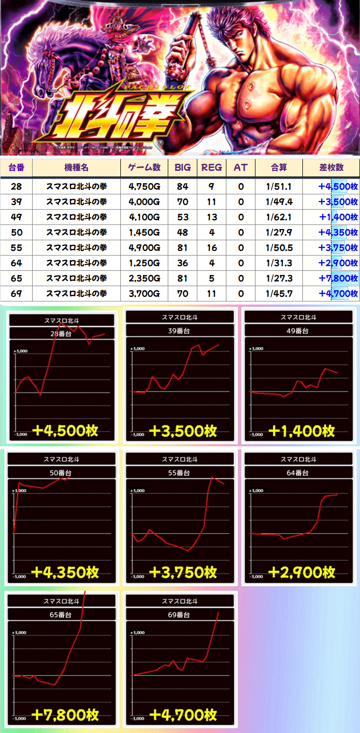 スーパーENJYOY機種「スマスロ北斗の拳」に7台列が出現! +3000枚以上の台が2台など優秀台がしっかりありました!