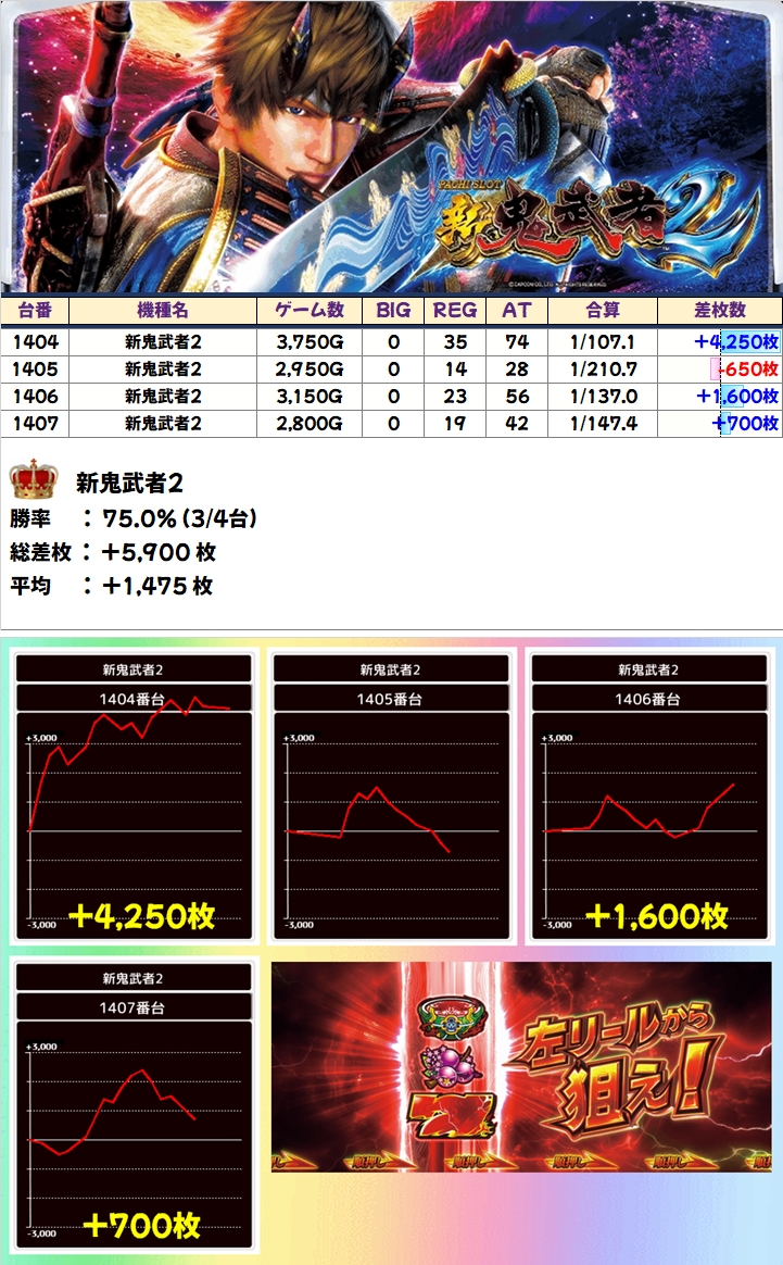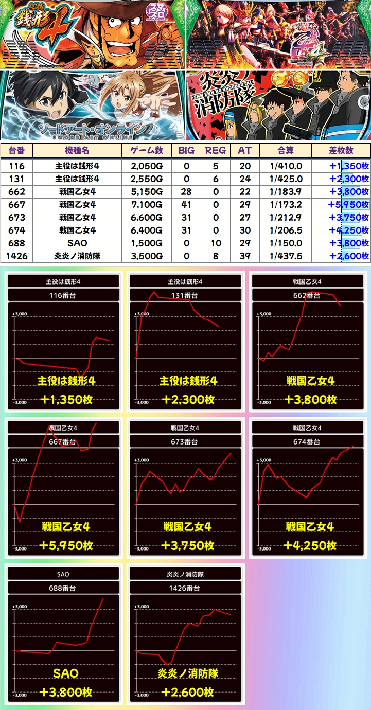 中でも「戦国乙女2」は+5950枚を筆頭に+3000枚以上が4台と相変わらずの強さを発揮!