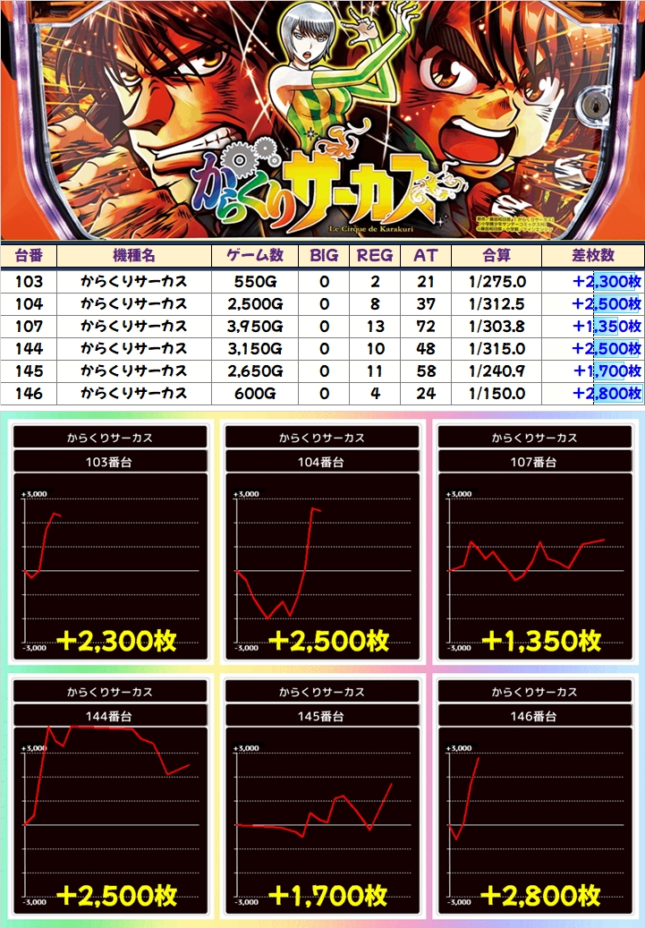 昨日「からくりサーカス」は全台系で万枚が3台出現し、総差枚+4.1万枚と出過ぎたためか、この日は打ち込み不足で出玉はやや物足りない結果に。それでも+2000枚以上が4台ありました!