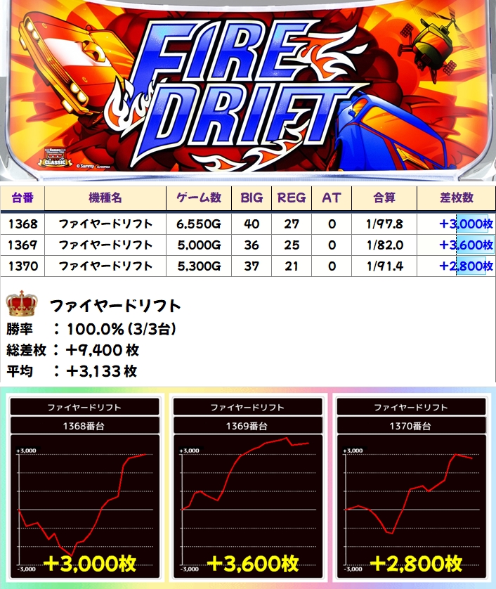 最新台「ファイヤードリフト」が+3000枚を筆頭に全台+2000枚以上で平均+3133枚と完璧な結果に!