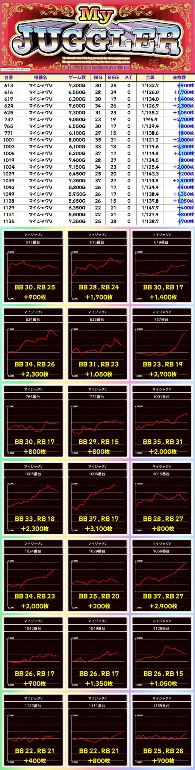 中でも「ゴージャグV」の1114番台はボーナス合算1/92で+3100枚とスゴかったですね! もう少し回されてたら何枚出たんでしょうね?