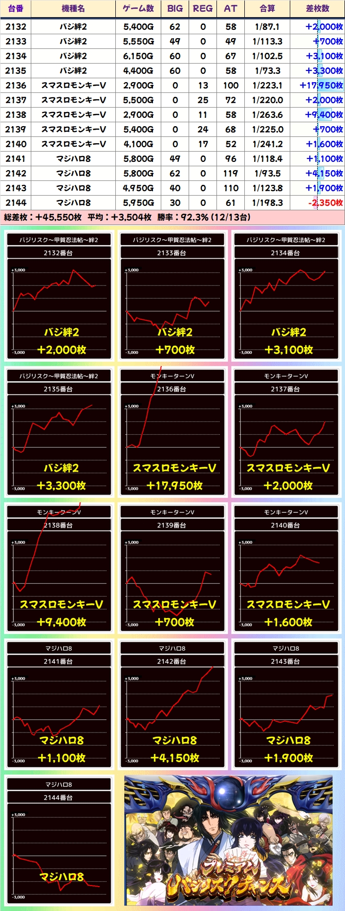 準新台のモンキー5&マジハロ8の設置がある列も列全だった模様で、この列13台で総差枚は45000枚超!特にモンキー5は9000枚超やコンプ台もありとかなり高品質な台がありました。