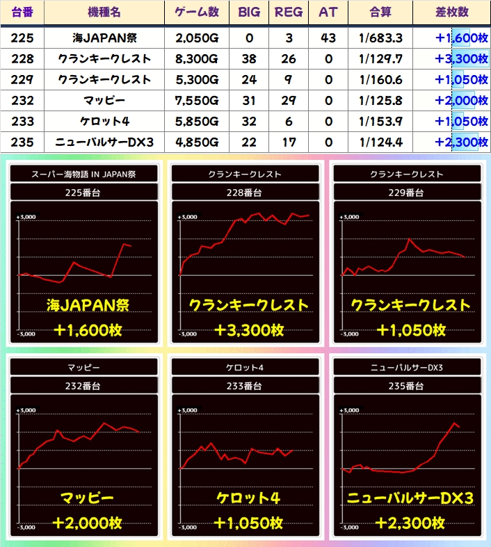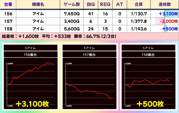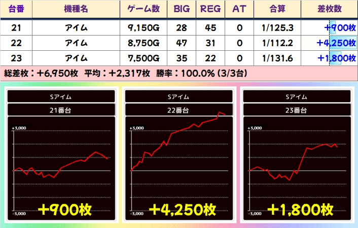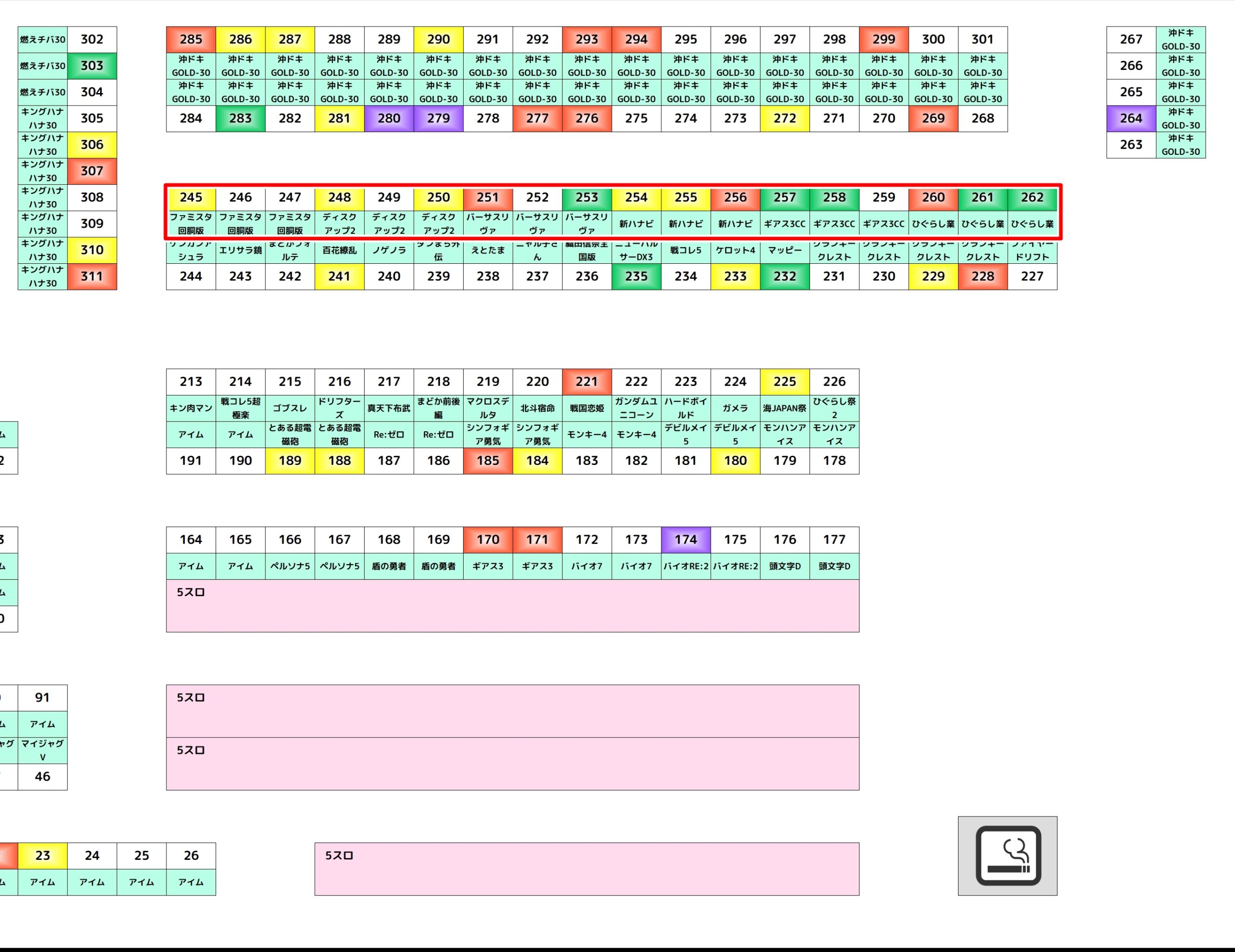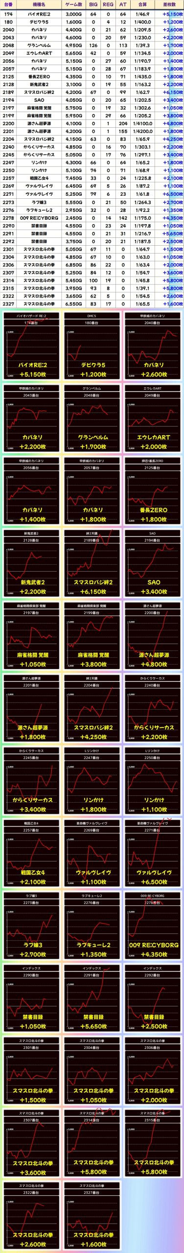 3台設置のノーマルが全台系の連続で列全だった模様。ノーマル機なだけあって多くの台が右肩上がり+プラスでした。多少番号が悪くても狙えるので、荒い勝負をしたくない方は狙い目です。