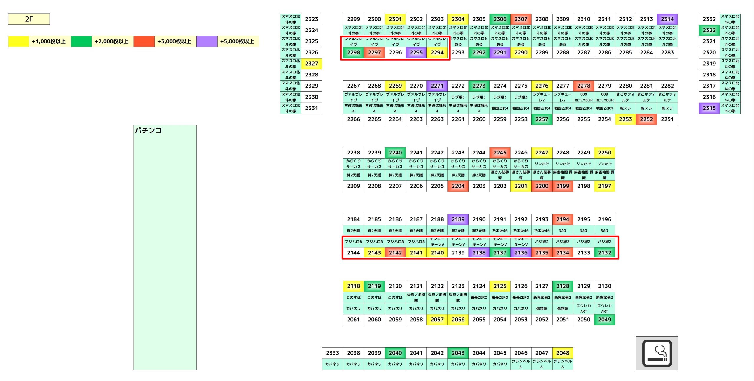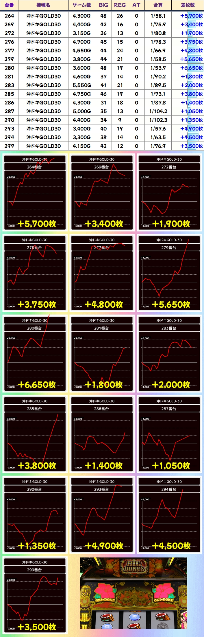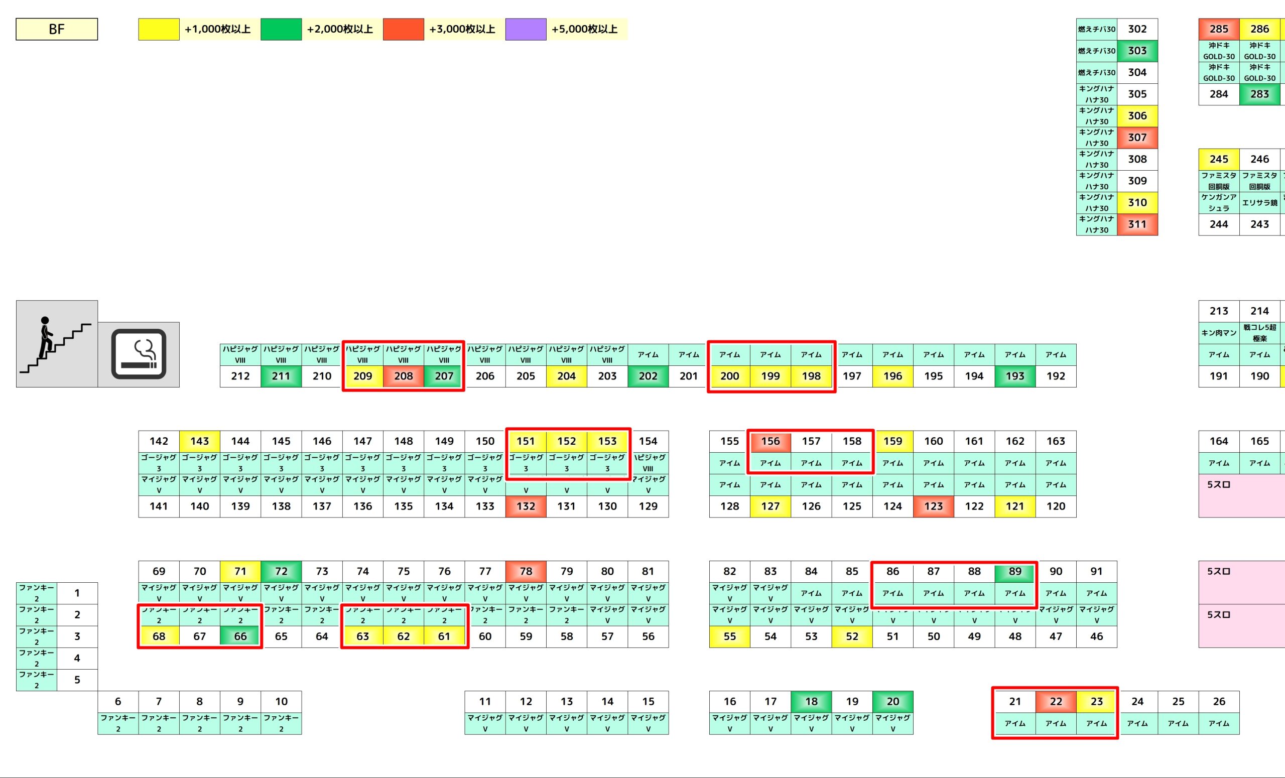 沖ドキも1/2以上がプラスで、3000枚以上獲得台は10台以上ありました。大量獲得台が連続している箇所が多く、3台並びが複数仕掛けられていた可能性は高そうです。279-281番台や285-287番台は間違いないでしょう。