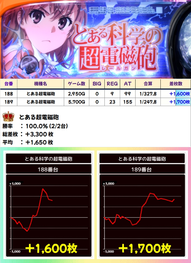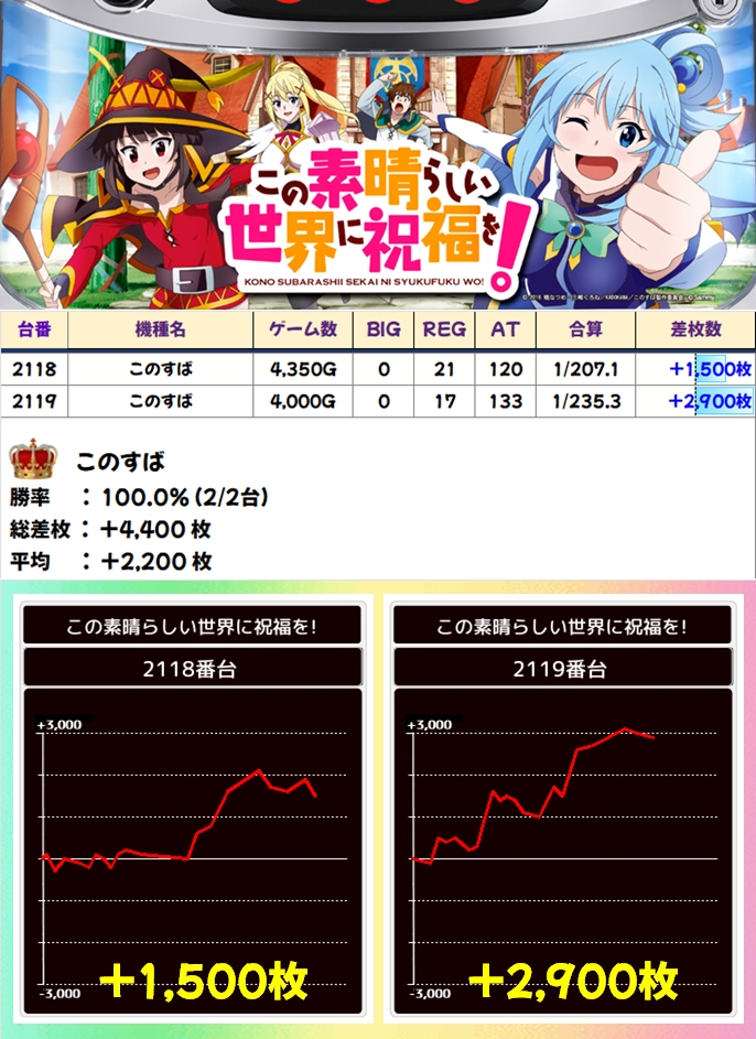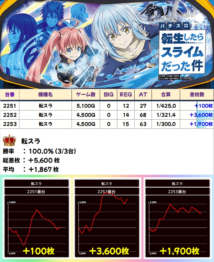 2Fの少台数機種にも全台系機種があり、転スラ・このすばは全台プラスでフィニッシュ。転スラの1台は失速してしまいましたが、残りは高設定らしい結果となりました。
