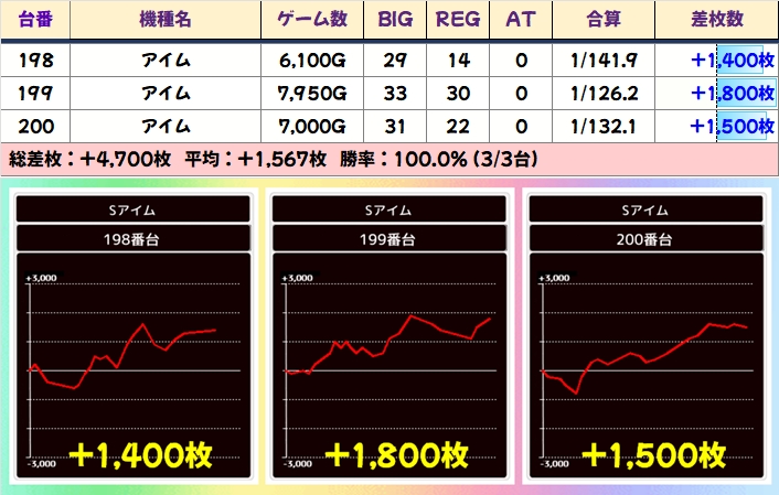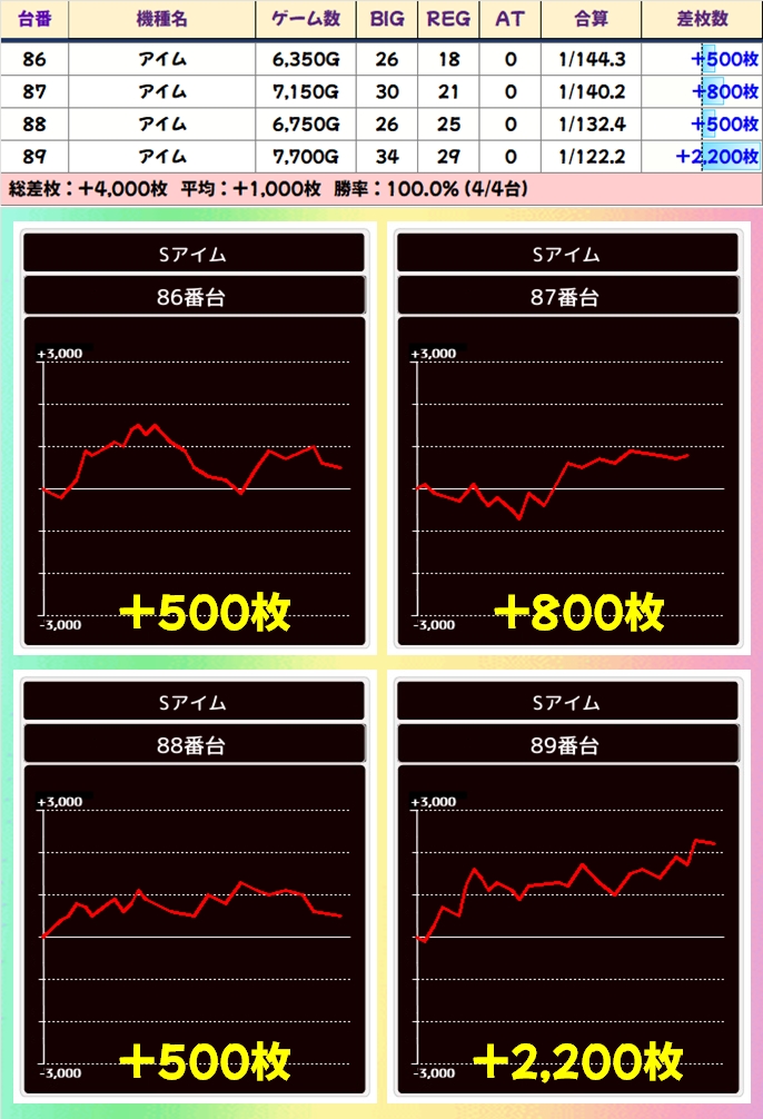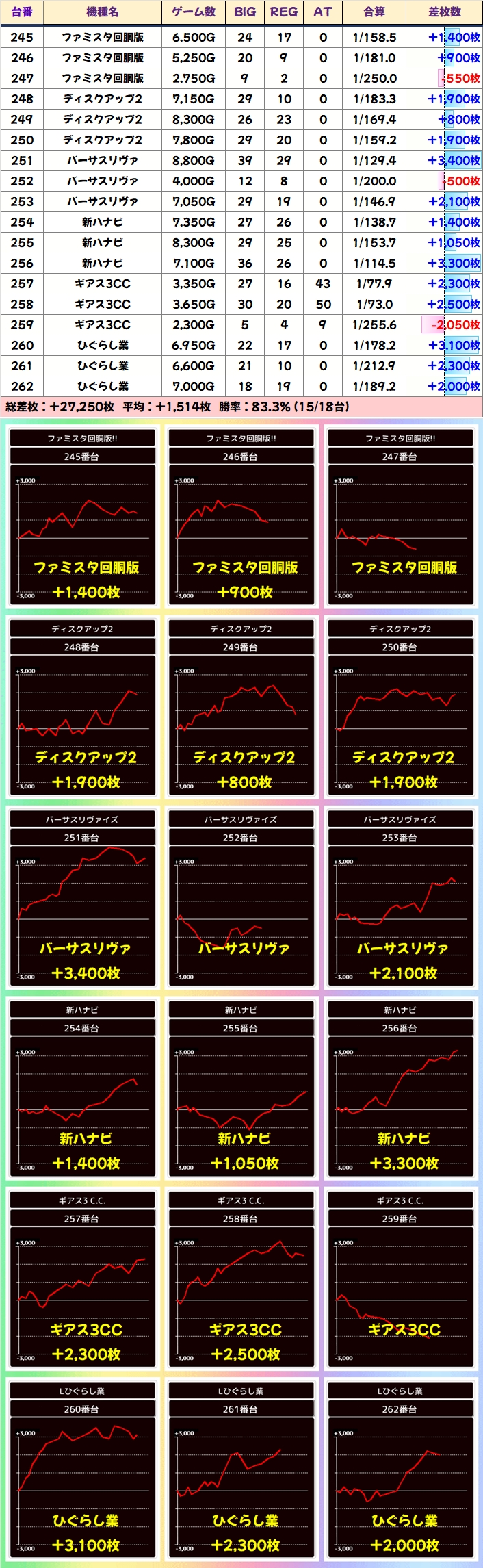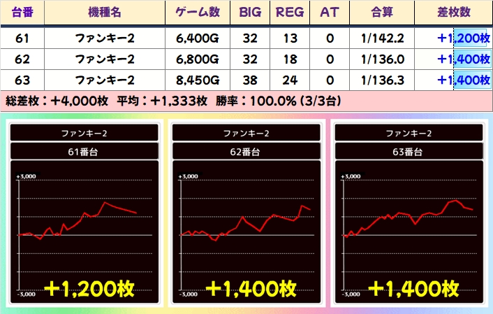 もちろん、それ以外にも多数の全台系や並びがあり、全体平均も素晴らしい結果でした。