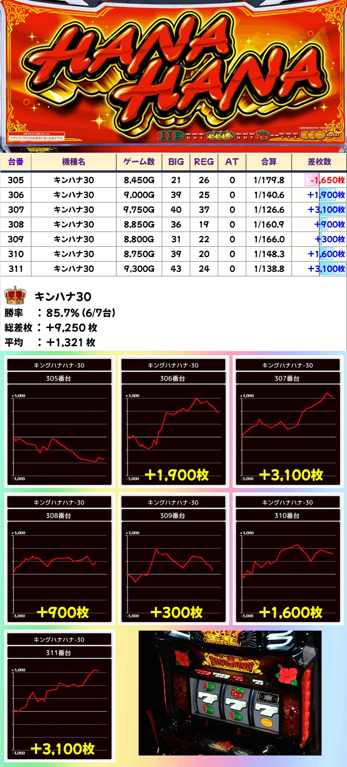 ハナハナは1台がマイナスでしたが、全台8000G以上回されており確保できた人は朝イチからがっつり回されていた様子。内容も良くプラス6台の内4台が1000枚以上を獲得しました。