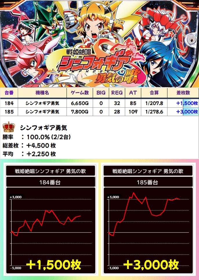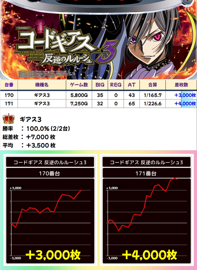 9の日でおなじみの2F少台数機種の全台系ですが、3の日にも仕掛けられました。ギアス3・シンフォギア・レールガンの3機種は全台1000枚以上のプラスと絶好調で、ギアス3とシンフォギアはブン回されているので確定演出などが確認できた可能性大!