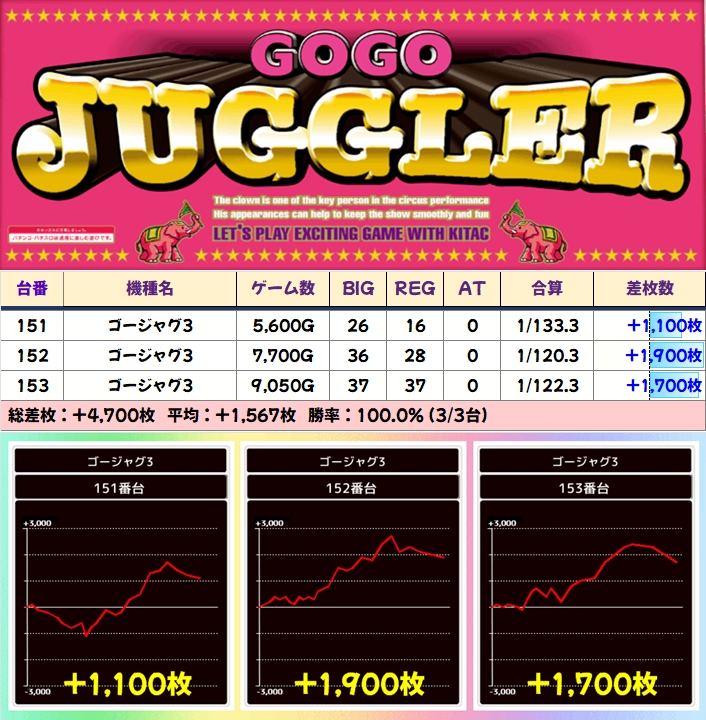仕掛け外のジャグシリーズから1000枚以上獲得台が15台以上!マイジャグは仕掛けはなかったものの、そのぶん単品ピックアップ台が多くありました。もともとジャグが強いのはユーザーも分かり切っているので稼働不足台はほとんどない素晴らしい結果でした。