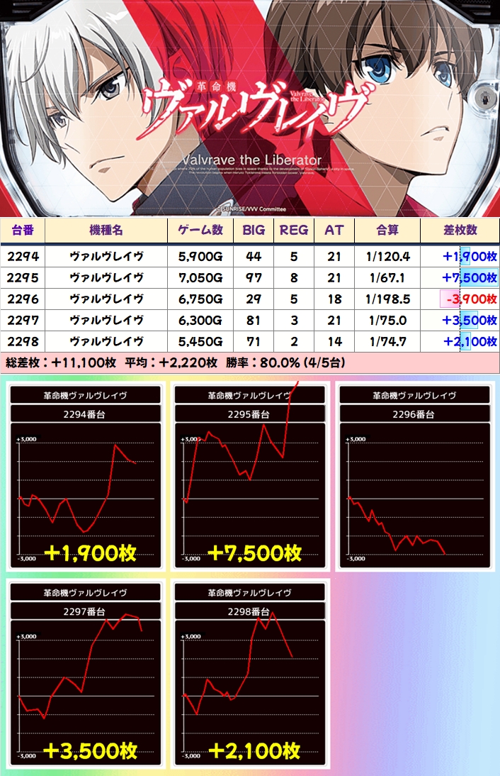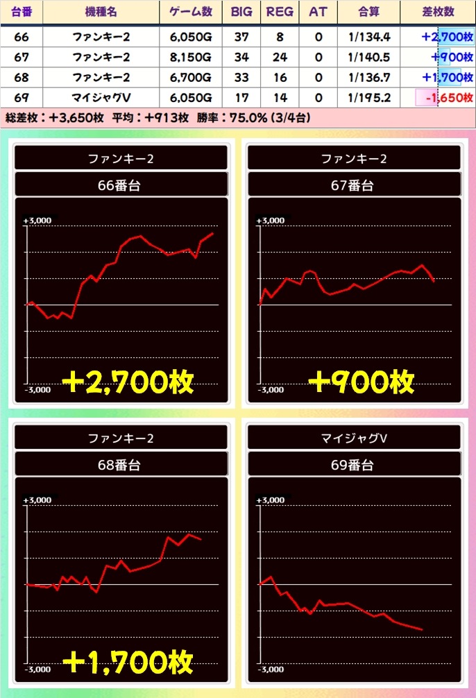 ヴヴヴも片列が全台系となり、4/5台が1000枚以上のプラス!最大獲得枚数は7000枚オーバーと、こちらもスマスロらしい大量出玉となりました。