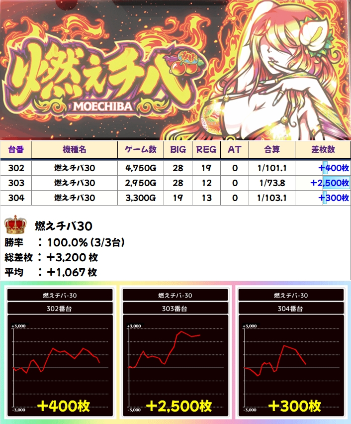 燃えチバも全台プラスで、1台が2000枚オーバー!燃えチバは仕掛けが入らないこともありますが、今回30Φは全機種仕掛けに絡みました。