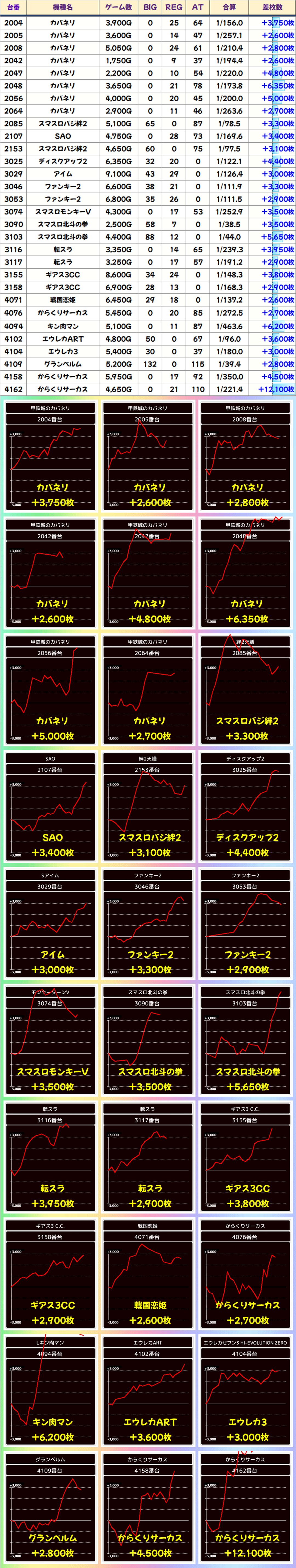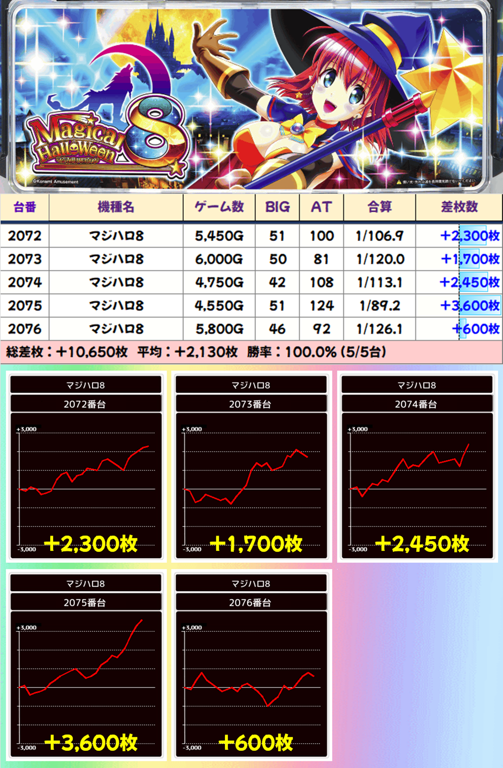 前日に列全の仕掛けがあった「マジハロ8」の2072~2076番台の5台が本日も好成績。おそらくサプライズの据え置き仕掛けだったと思われます。