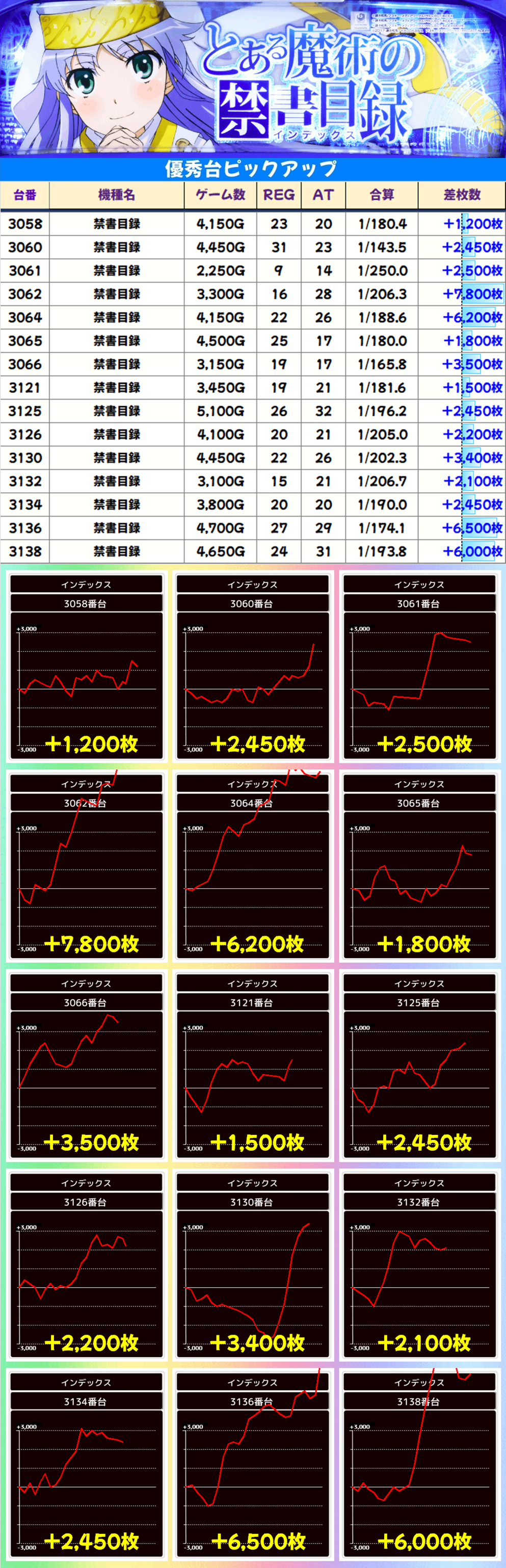 毎日オススメ機種の「とある禁書目録」は1/2系以上の高配分。総差枚+37500枚、平均差枚+1250枚で30台中18台がプラス差枚となりました。
