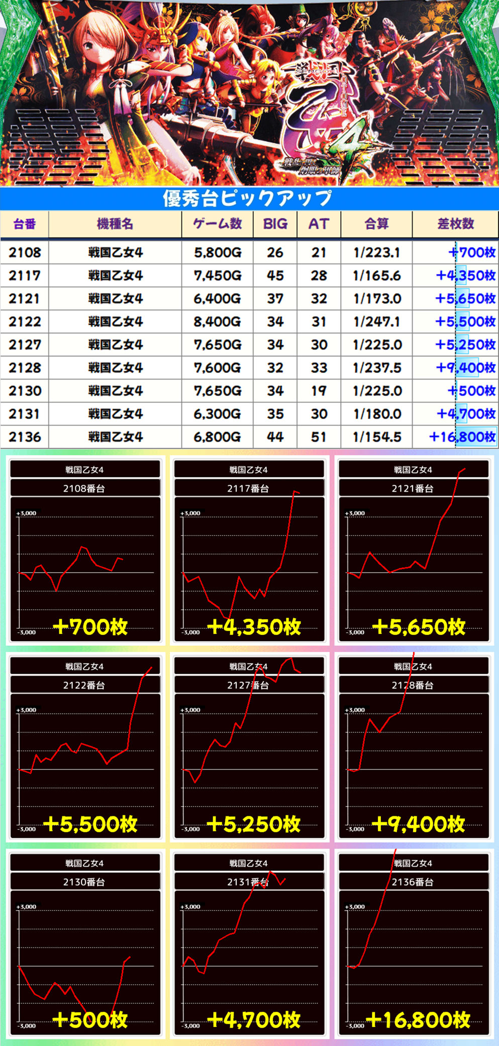 「戦国乙女4」は単品仕掛け。+16800枚を筆頭に大爆発台が多数出現! 7台が差枚数+4000枚以上の大勝利!
