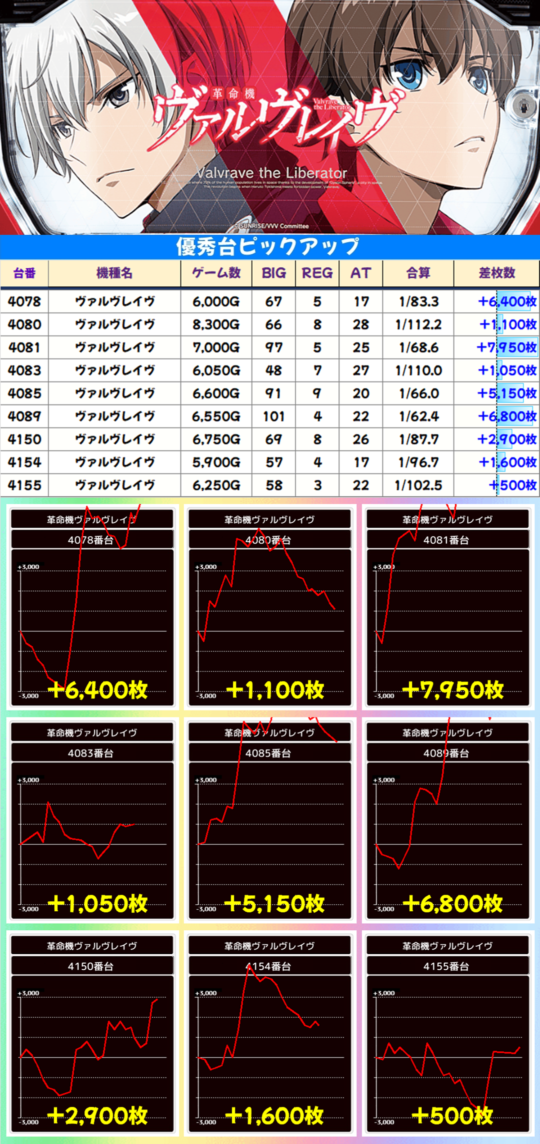 同じく「ヴァルヴレイヴ」も単品仕掛け。誰もが知る爆裂機だけあって本日も5000枚オーバーの出玉が続出しました。