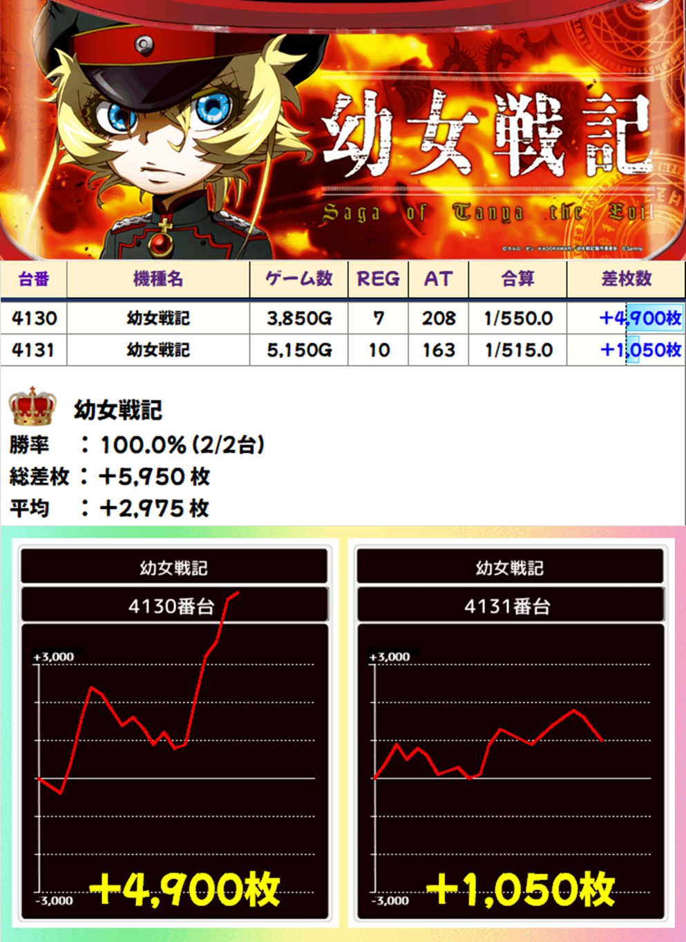 2台設置の「幼女戦記」は平均差枚+2975枚で全台プラス差枚。後半伸びた4130番台が5000枚近い出玉を獲得しました。