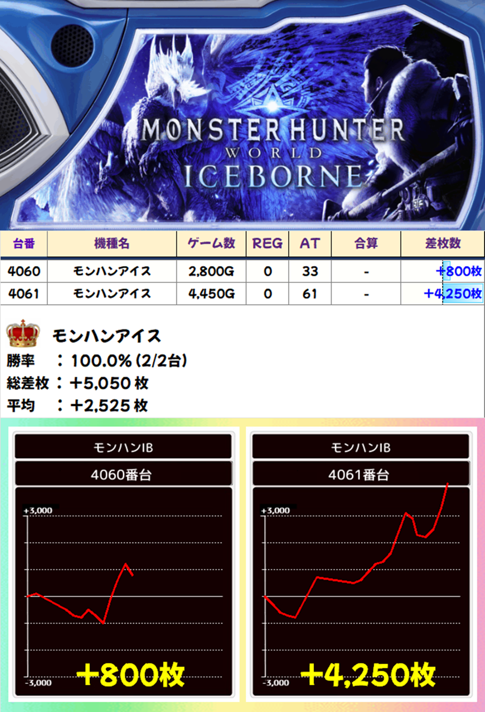 「モンハンアイス」も2台ともプラス差枚。4000枚オーバーの爆発台も出現しました。