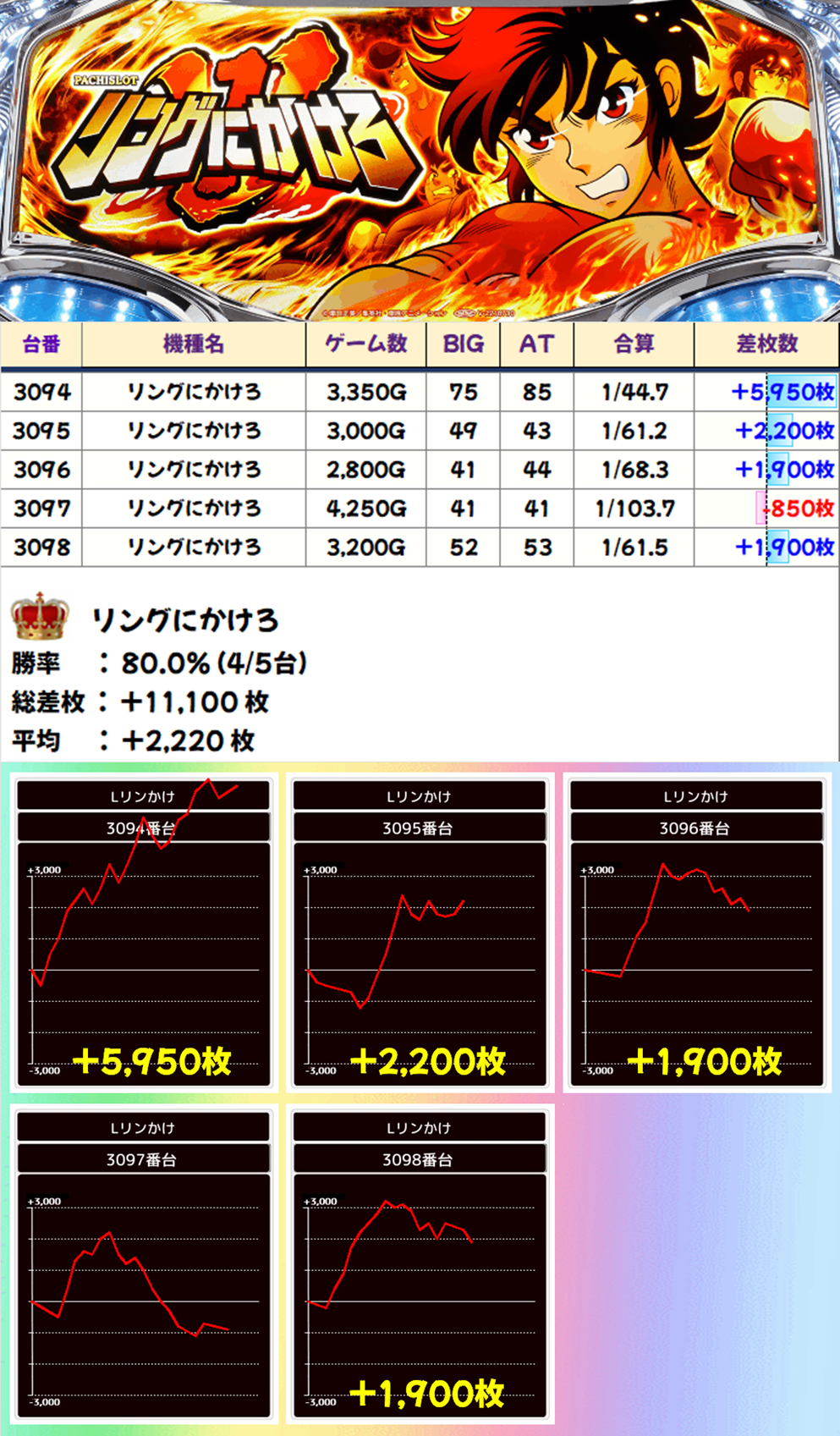 「リングにかけろ」は平均差枚+2220枚で4台がプラス差枚。差枚数+5950枚の大爆発台も出現しました。