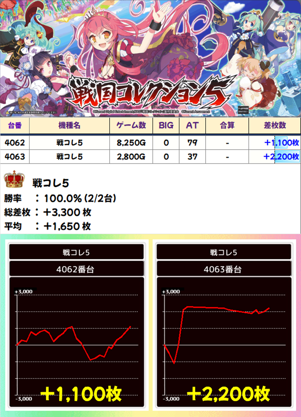 2台設置の「戦コレ5」は平均差枚+1650枚で2台ともプラス。4063番台の打ち込みが伸びていたらもっと派手な出玉になっていたでしょうね。