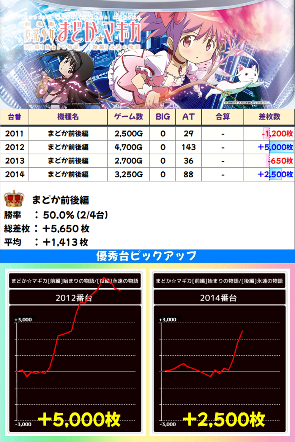 「まどか前後編」は平均差枚+1413枚で4台中2台がプラス差枚。プラスの2台は+5000枚、+2500枚の大勝利を収めました。