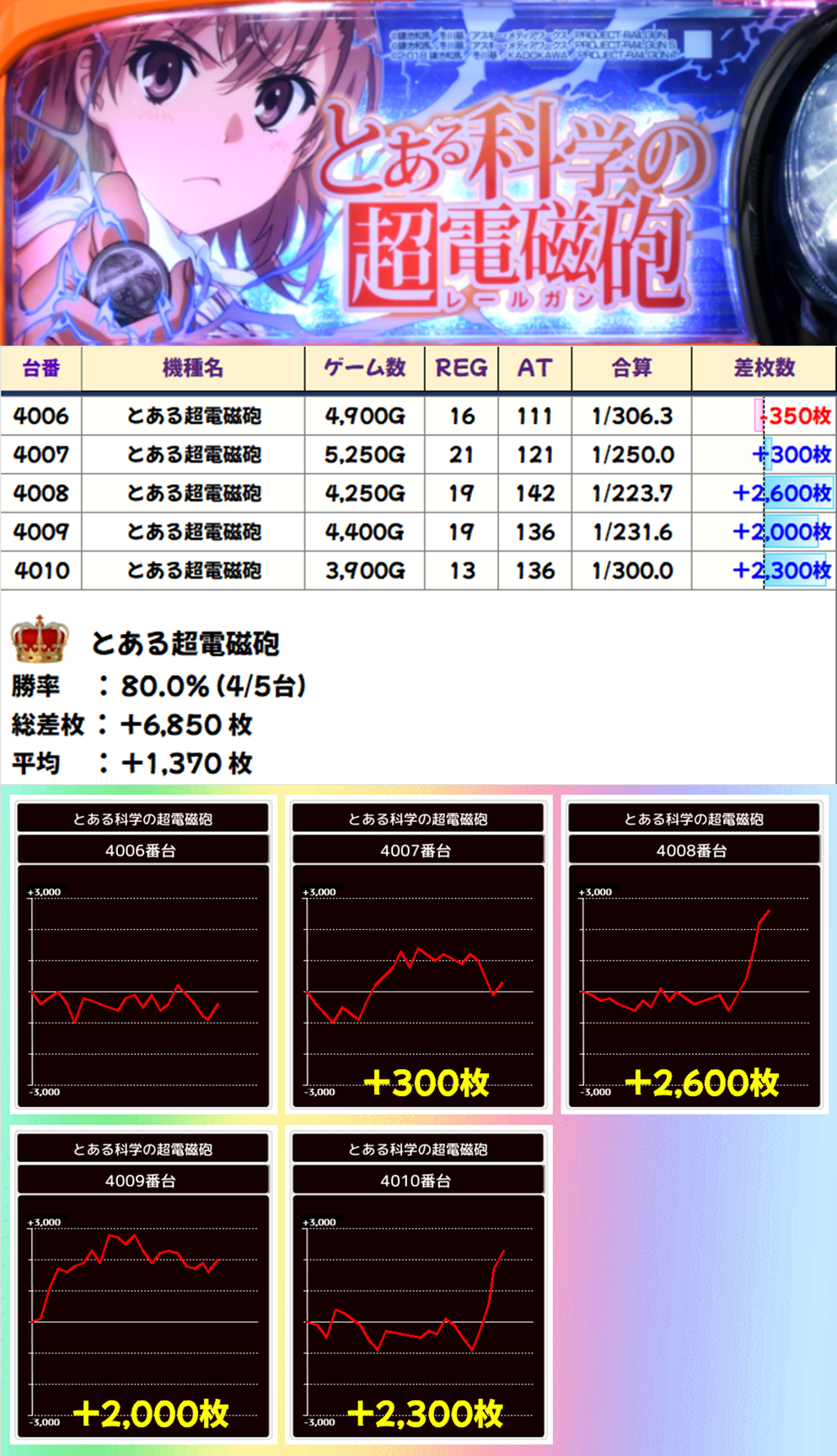 5台設置の「とある超電磁砲」は平均差枚+1370枚で4台がプラス差枚。3台が2000枚以上の出玉を獲得しました。