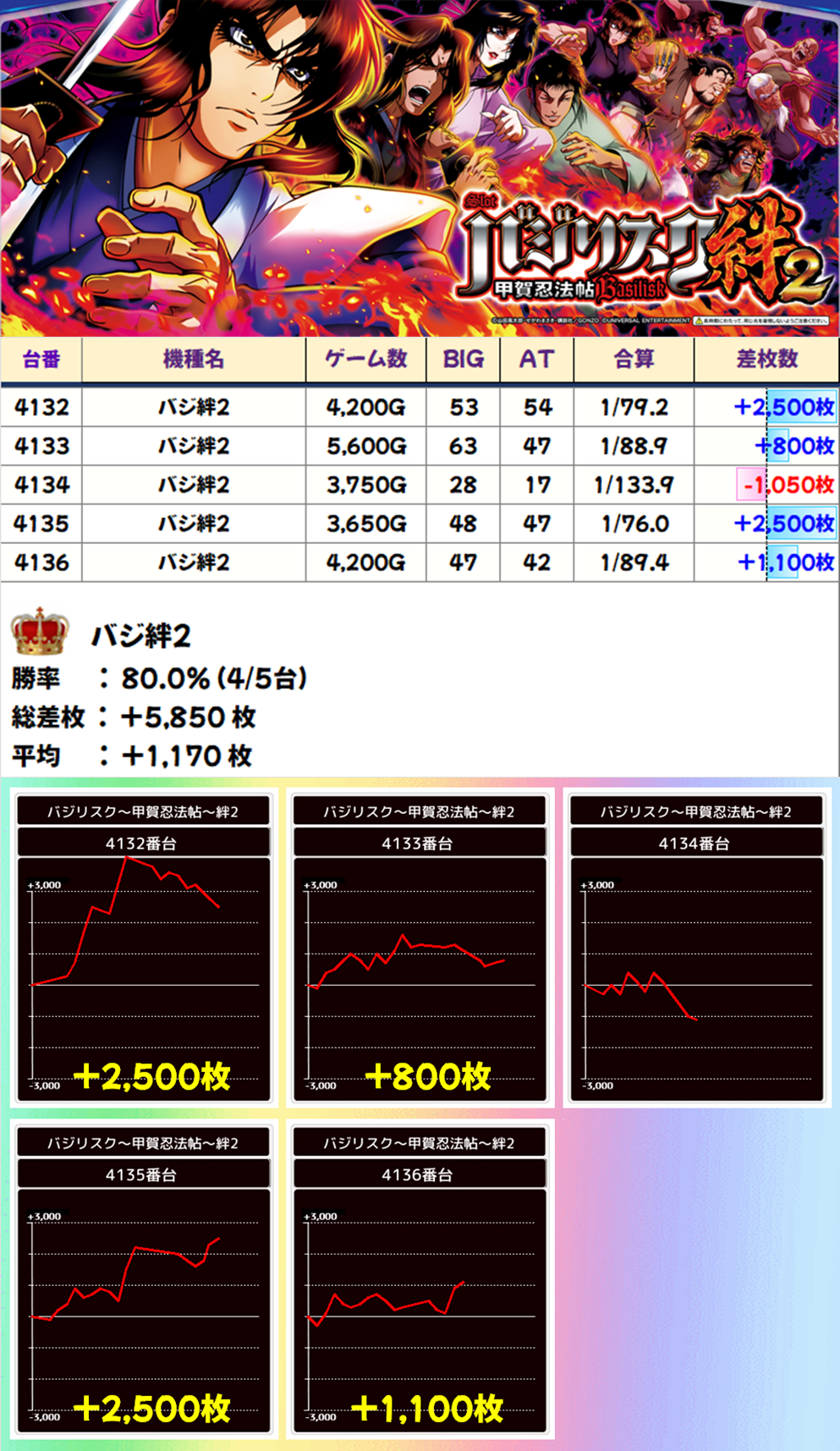 5台設置の「バジ絆2」も優秀台だらけ。平均さ枚+1170枚で4台がプラス差枚となりました。