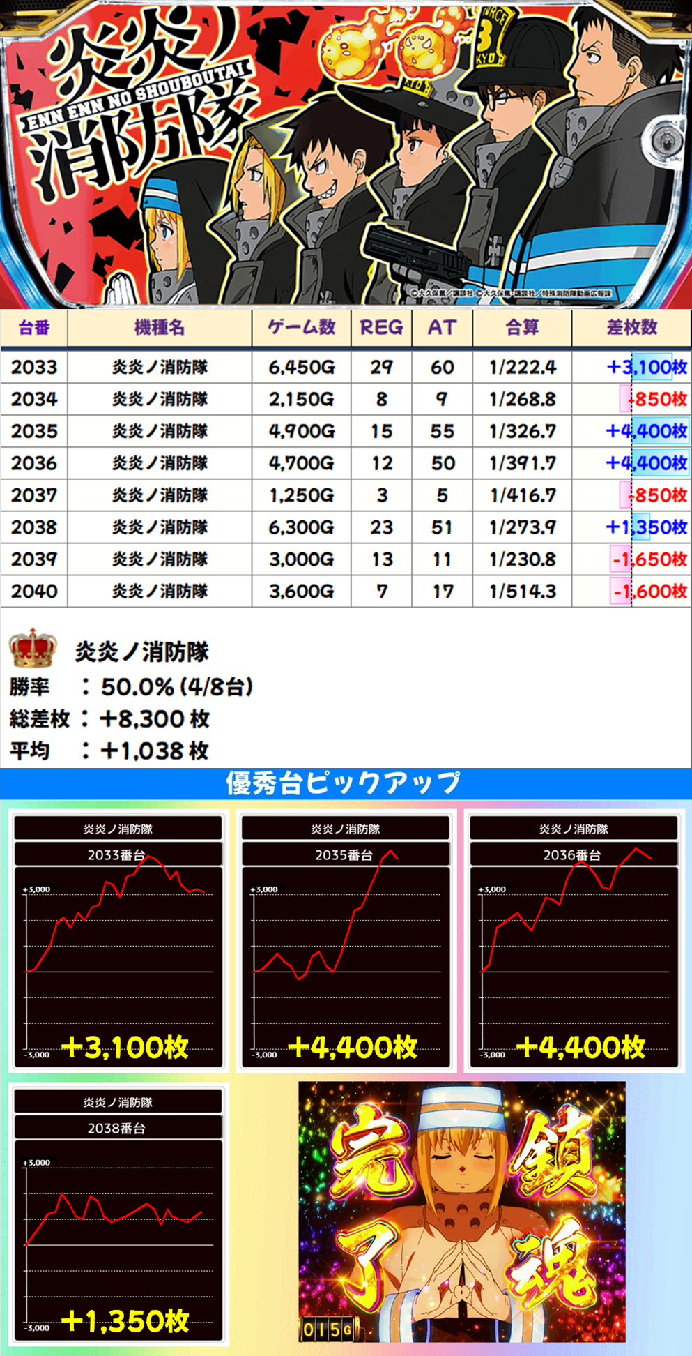 8台設置の「炎炎ノ消防隊」は平均差枚+1038枚で8台中4台がプラス差枚。4000枚オーバーが2台と大量出玉獲得台も複数出現しました。