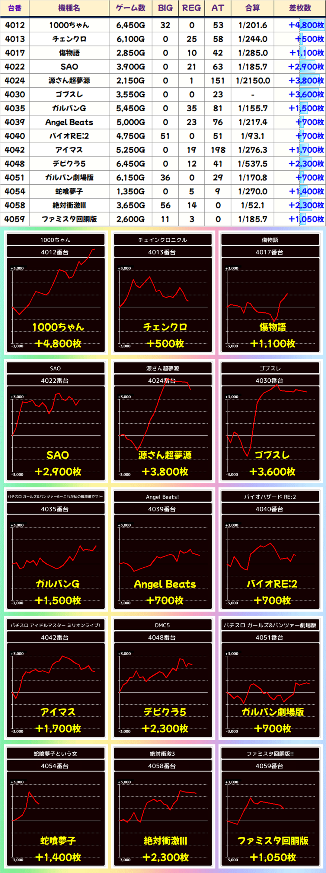 お宝台5台並びの列全の結果は平均差枚+2130枚で全台プラス差枚。4台が1000枚以上の出玉を獲得しました。