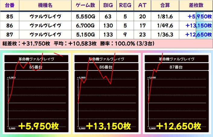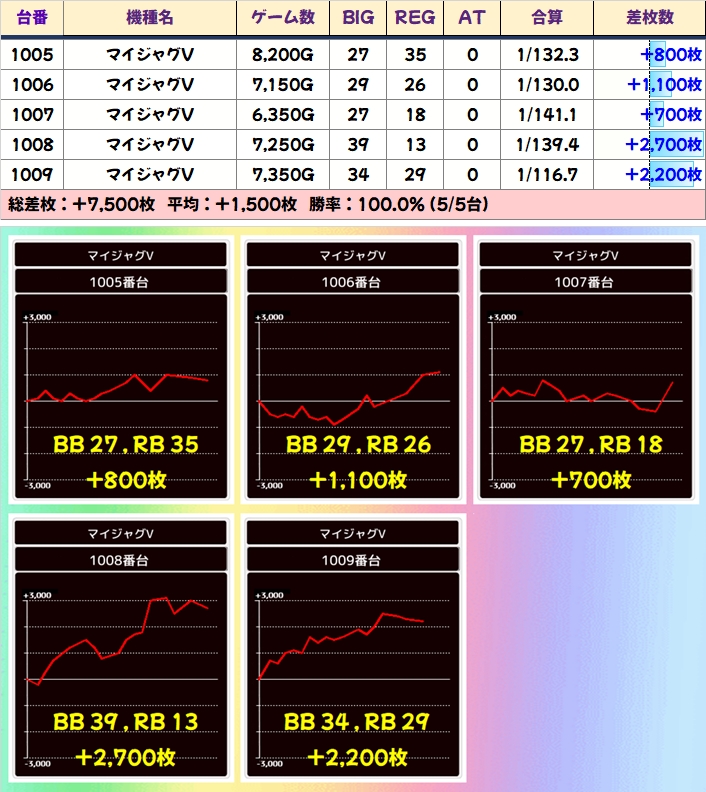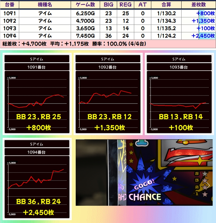 4台並びも2か所ありましたが対象の8台は大きなプラスで、平均+4700枚と平均+3475枚と素晴らしい結果を残しました!