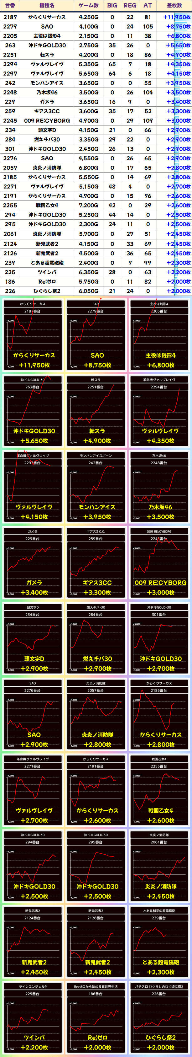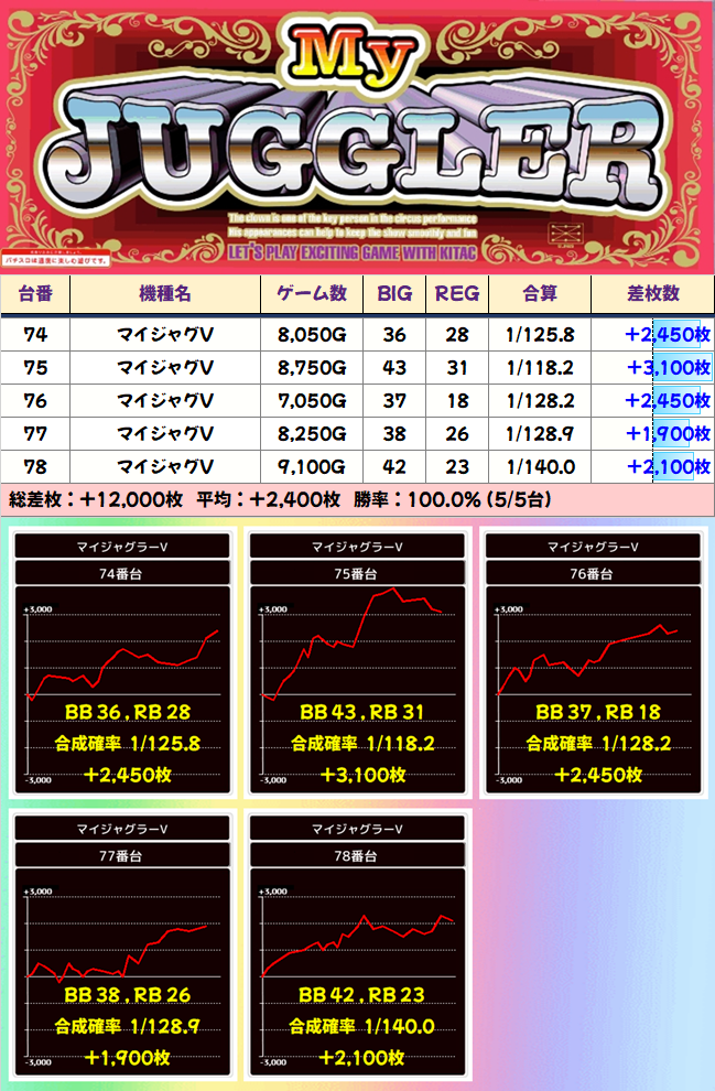 これは強烈な5台並び!5台全てが⑤⑥の近似値になっています!5台全台プラス・平均2400枚でした!マイV全体でも500枚を超える素晴らしい結果になっています!