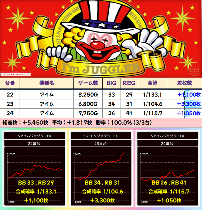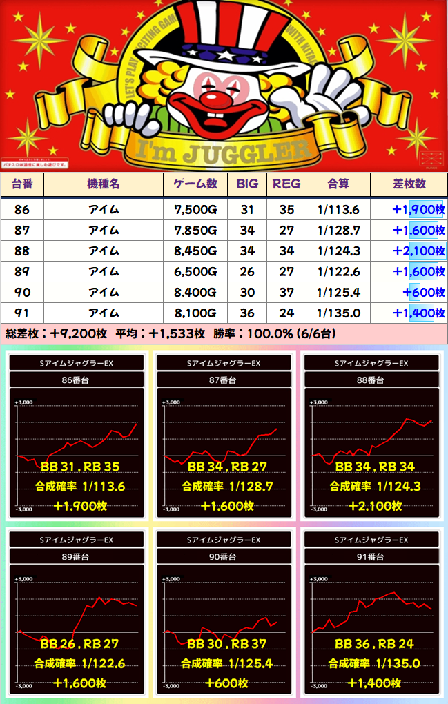 141台あるジャグラーで8.5万枚の大放出!全てのシリーズのジャグラーが当然の如くプラスの素晴らしい結果になっています!さらに全台系や列全、優秀な塊もしっかり見えています!