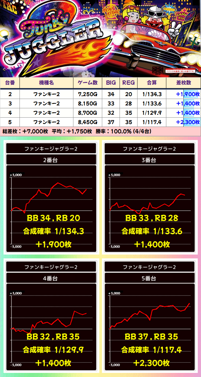 この1番~10番のファンキーには高い頻度で仕掛けはいります!今回も明確な4台並びがありました!結果は出ませんでしたが1番を含め5台並びの可能性大です!この他にファンキーには多くの単品優秀台もあり!全体でもしっかりプラスになっています!