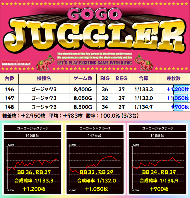3台並びもあり!終日安定した展開で3台ともにプラスになっています!