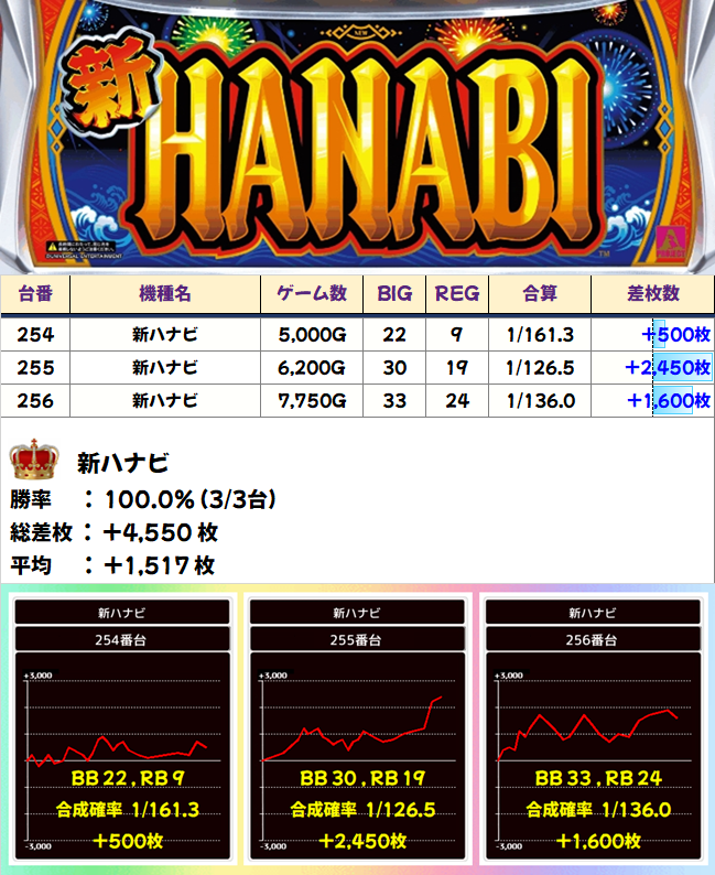 こちらもAタイプの「新ハナビ」!3台全台プラス!平均1500枚!安定した右肩上がりのグラフになっていますね!