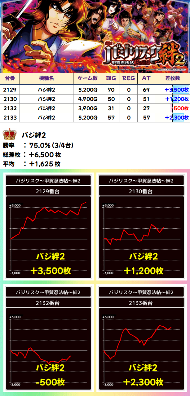 まずは直近新台の「傷物語」が全台系に!6台全台プラス!平均2500枚を超える満足な結果に!