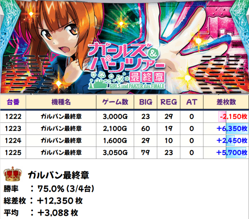 4台設置の「ガルパン最終章」は4台中3台がプラスで平均差枚も+3088枚と優秀な結果で、全台系もしくは1/2系以上濃厚でした。
