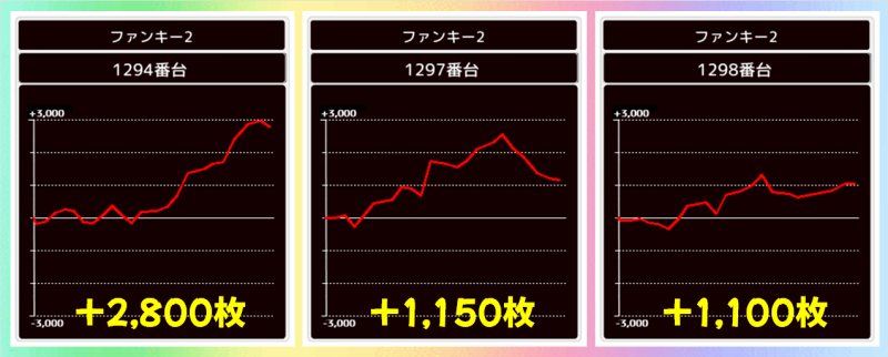 3台設置の「吉宗RISING」は1台が+6050枚の差枚をたたき出し総差枚+5700枚、平均+1900枚という結果でした。残りの2機種は惜しくもプラスにはならなかったが、比較的稼働も良かったようです。