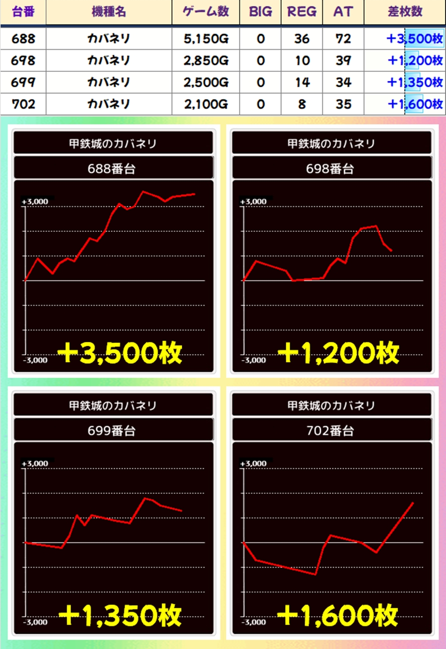 毎日カブくぜ機種や毎日オススメ機種から優秀並びが大量!毎日オススメ機種なので仕掛けが手厚いのは当たり前ですが、並びからマイナス台が1台もないというのはスゴすぎます!台平均のほとんどが1000枚以上のプラスで、モンキーターンVからは7000枚以上のプラス台も出現!