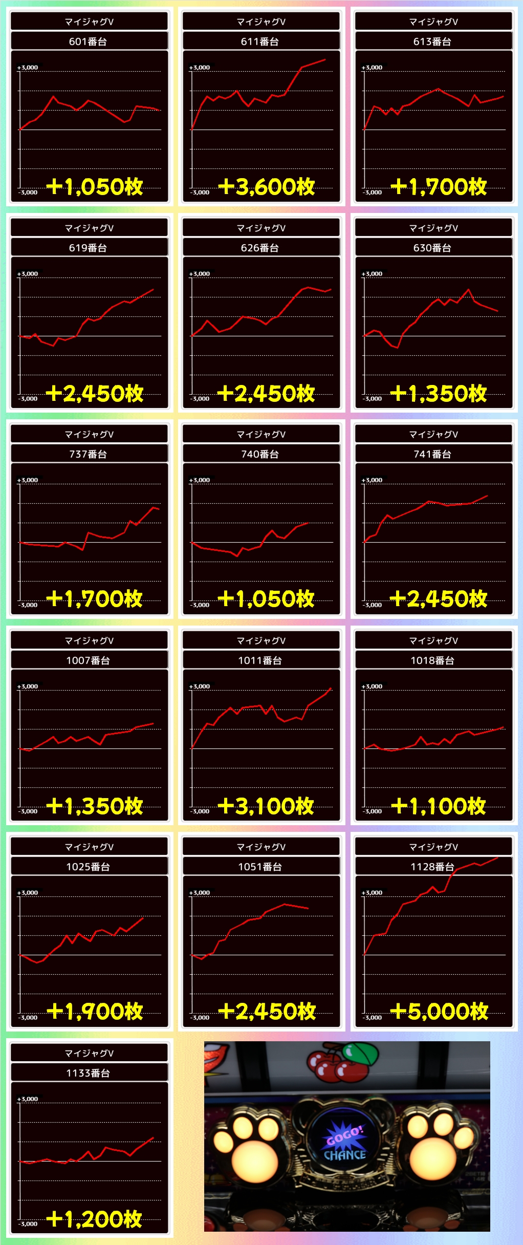 「ヴァルヴレイヴ」からは+11700枚の万枚を筆頭に4台が+2000枚以上の好成績!並びも含めるとかなり優秀な結果でした。