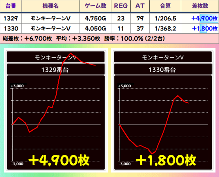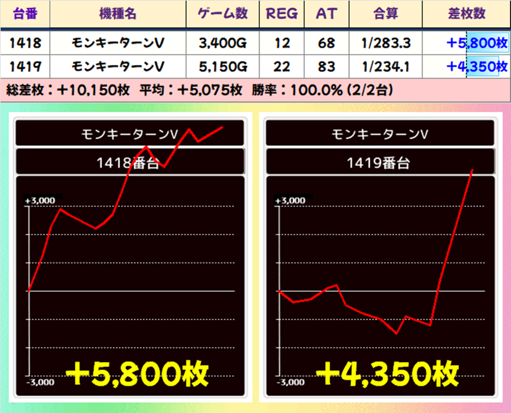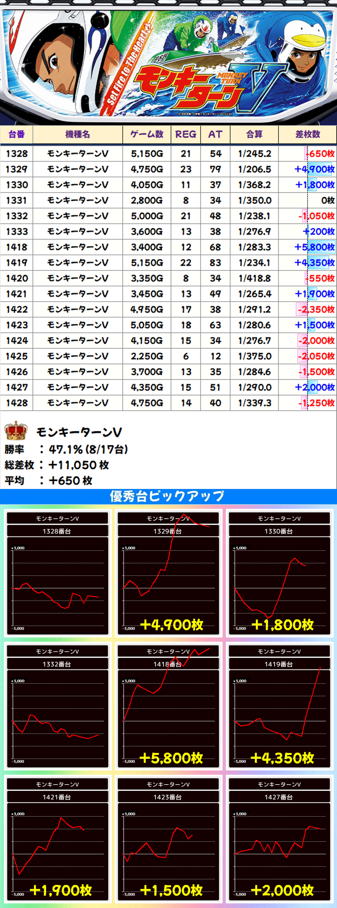 後述する並び仕掛けも2か所複合していた「モンキーターンV」の結果は総差枚+11,050枚、平均差枚+650枚で17台中8台がプラス差枚。+5,800枚を筆頭に7台が1,000枚以上の出玉を獲得しました。