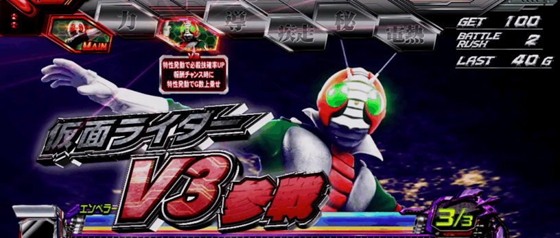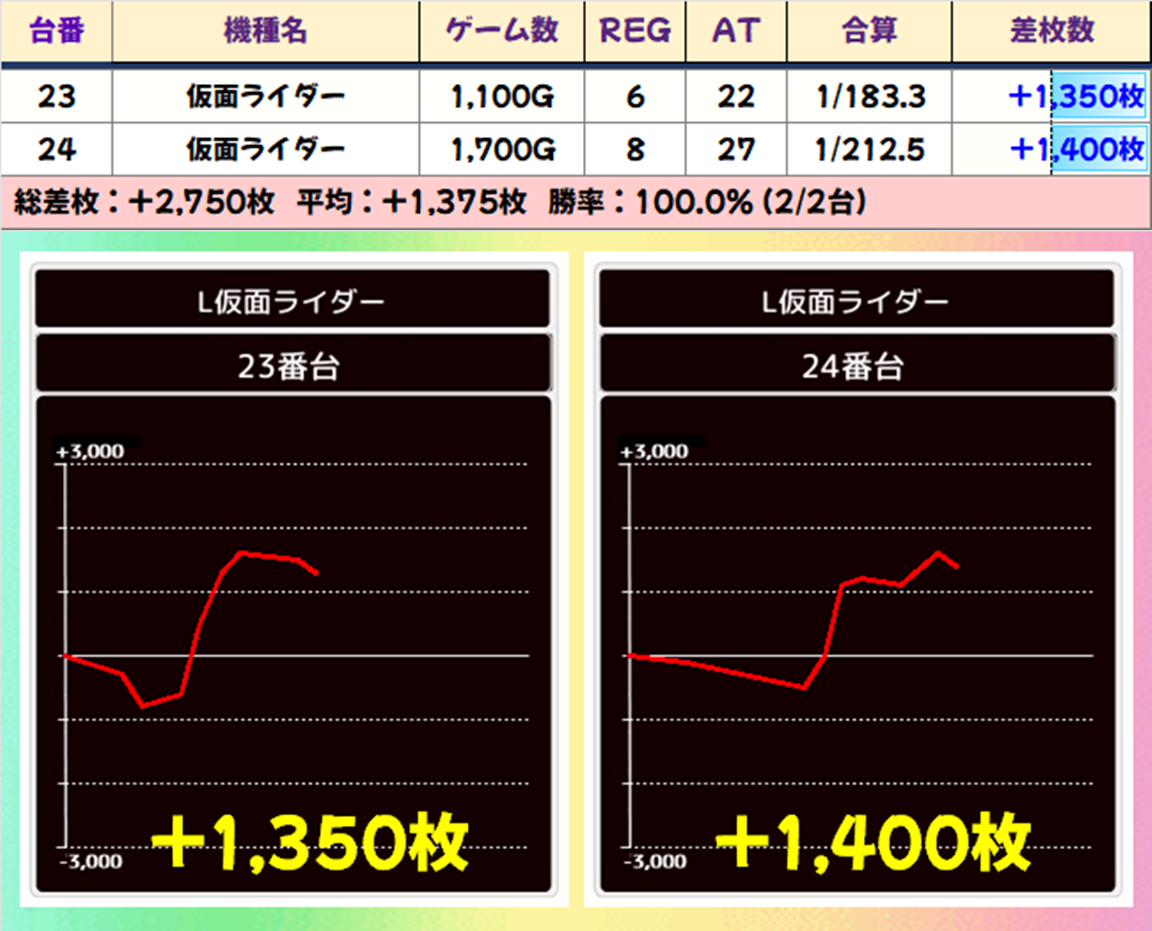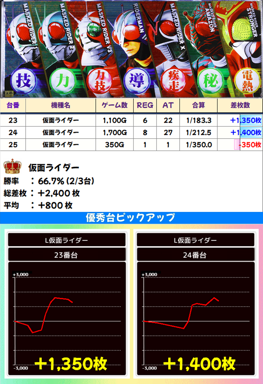 3台設置の「仮面ライダー」が1/2系濃厚。結果は平均差枚+800枚で2台がプラス差枚。プラスの2台はともに1,000枚以上の出玉を獲得しました。