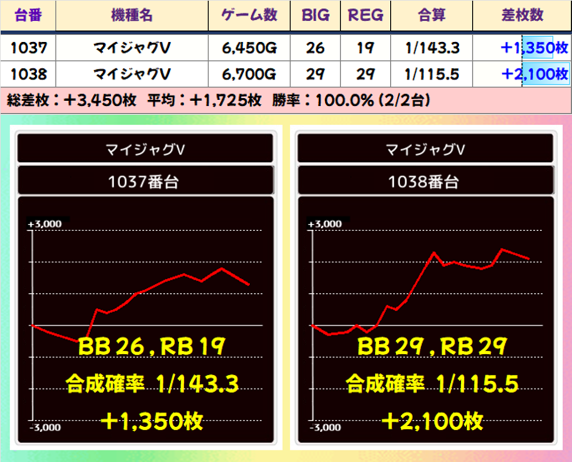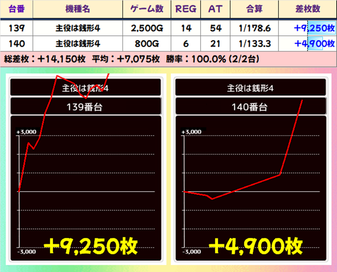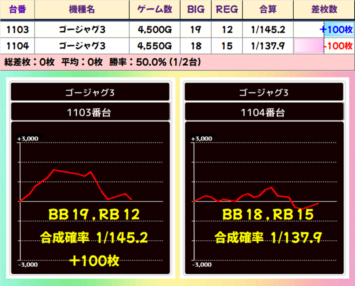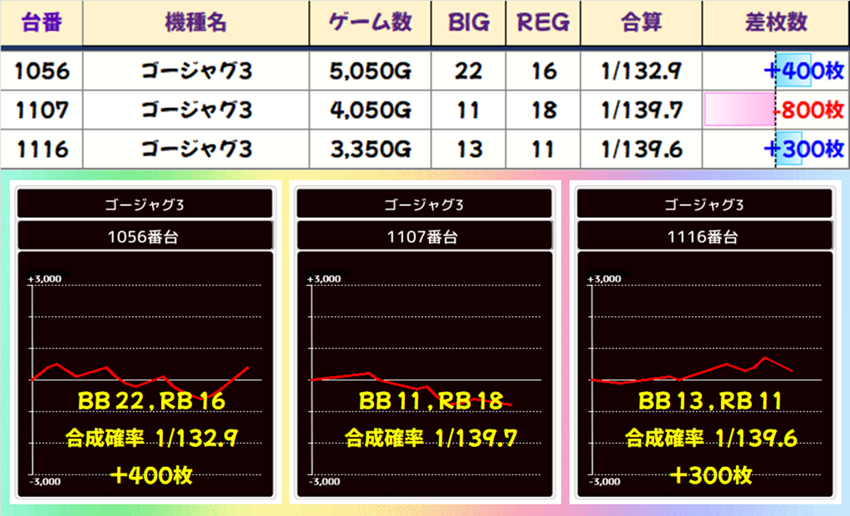 結果は平均差枚+400枚で3台中2台がプラス差枚。打ち込みが伸びていればもっと盛り上がっていたでしょうね。